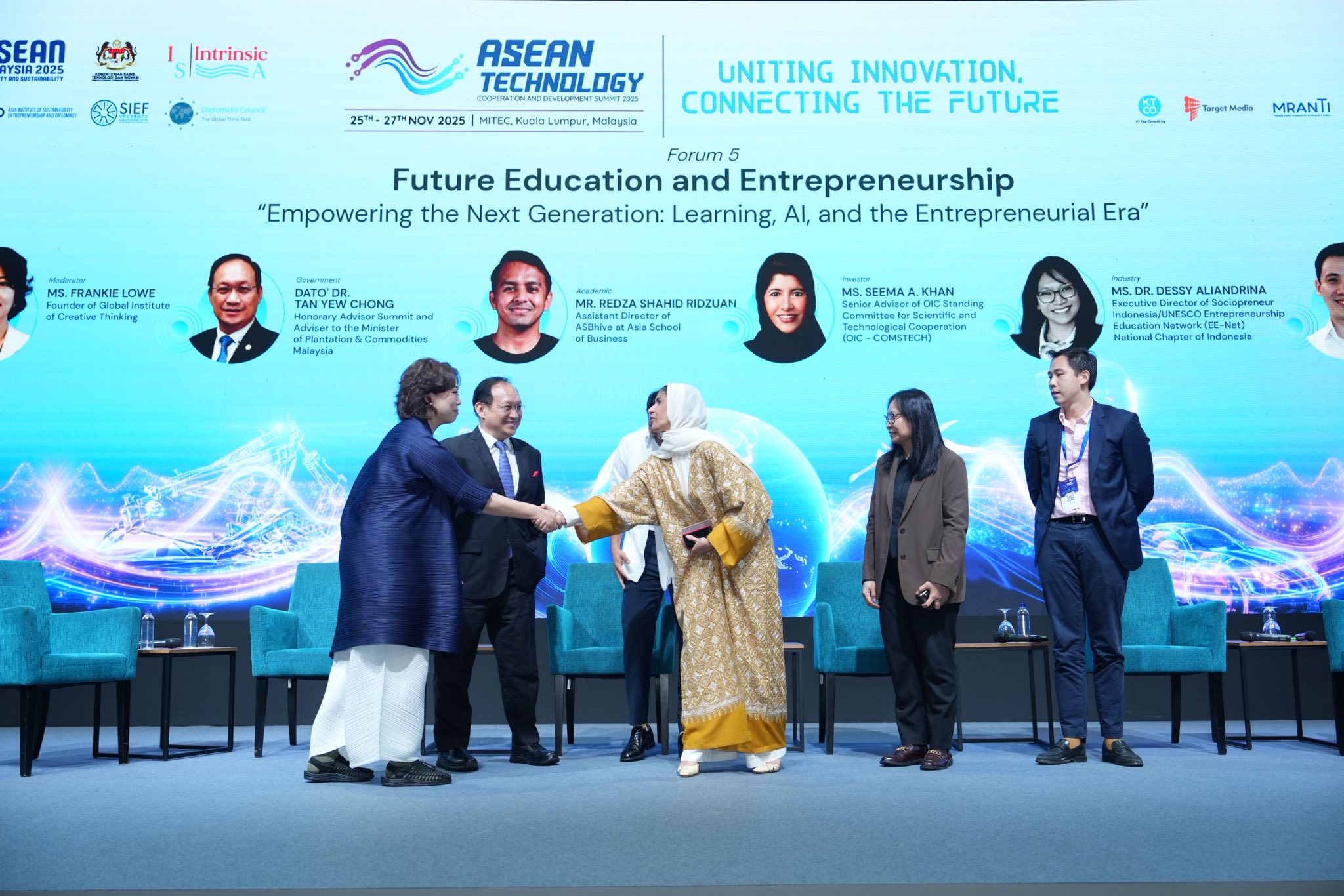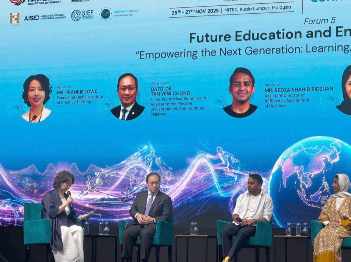 Moderated by Ms Frankie Lowe, Founder & President of the Global Institute of Creative Thinking / Frankie Lowe Foundation (Geneva), the session brought together visionary thinkers from across the region to explore how education must evolve in an increasingly tech-driven world.